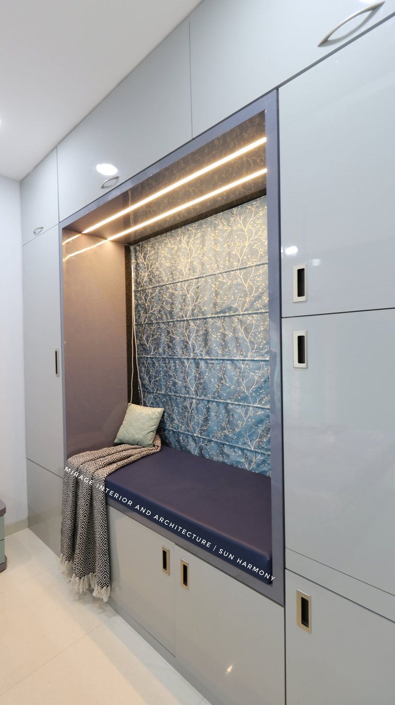 The minimalistic interior exudes a sense of calm and sophistication, featuring curved designs in both the false ceiling and furniture. This clever use of curves softens the space, creating an inviting atmosphere that blends functionality with aesthetic appeal. The trendy color palette, dominated by soothing shades of pastel and grey, enhances the lightness of the room, allowing natural light to play off the subtle hues. Each element in the design has been carefully chosen to maintain a sense of simplicity, yet delivers a striking visual impact. The overall effect is a harmonious environment that feels both modern and timeless, perfect for those who appreciate refined elegance in their living spaces.